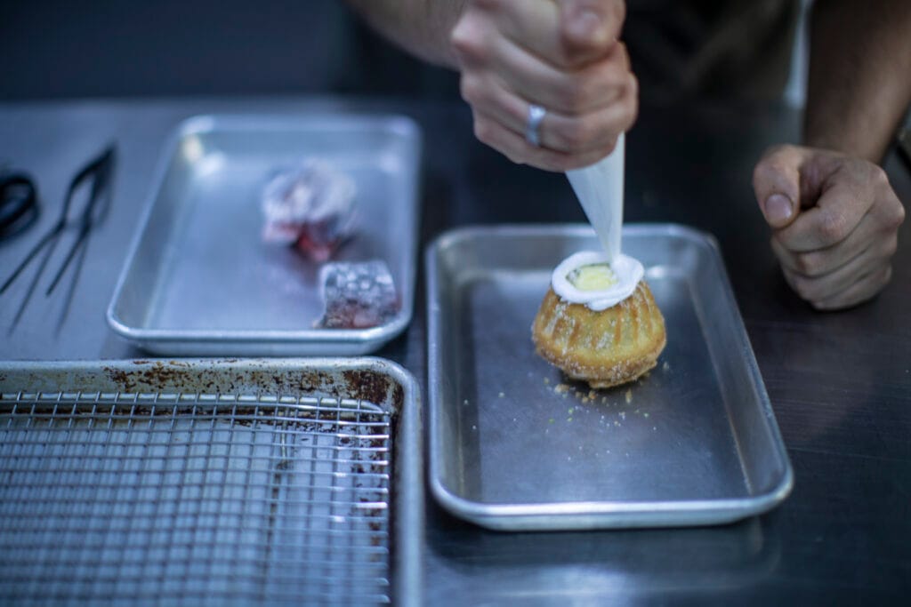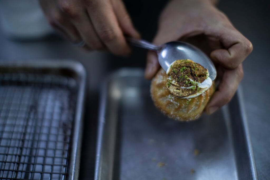 By the right side of the entrance, accompanied by high chairs, the curation commences with classic Profiteroles, the hype bombolinnis, creative cocobuns, and seasonal regional specialties. This intimate corner offers an unparalleled sweet experience.